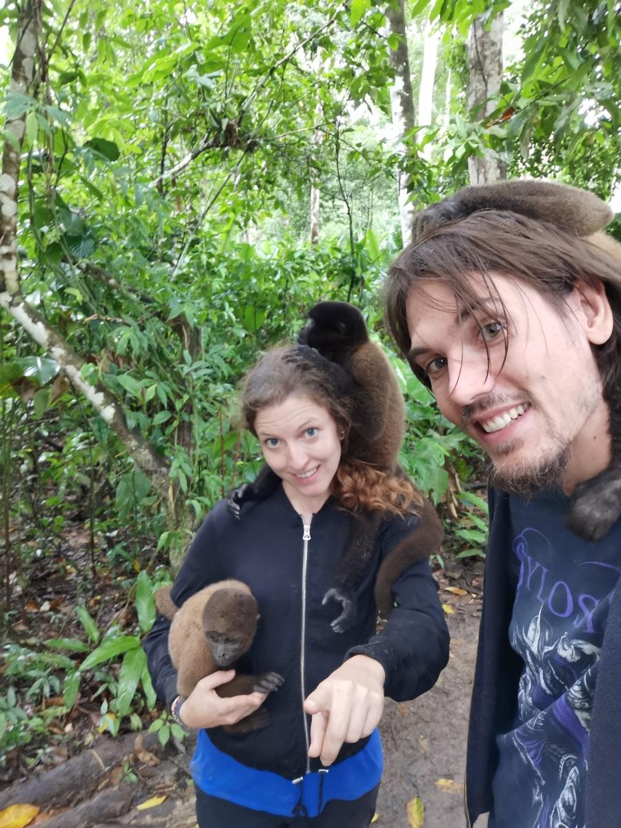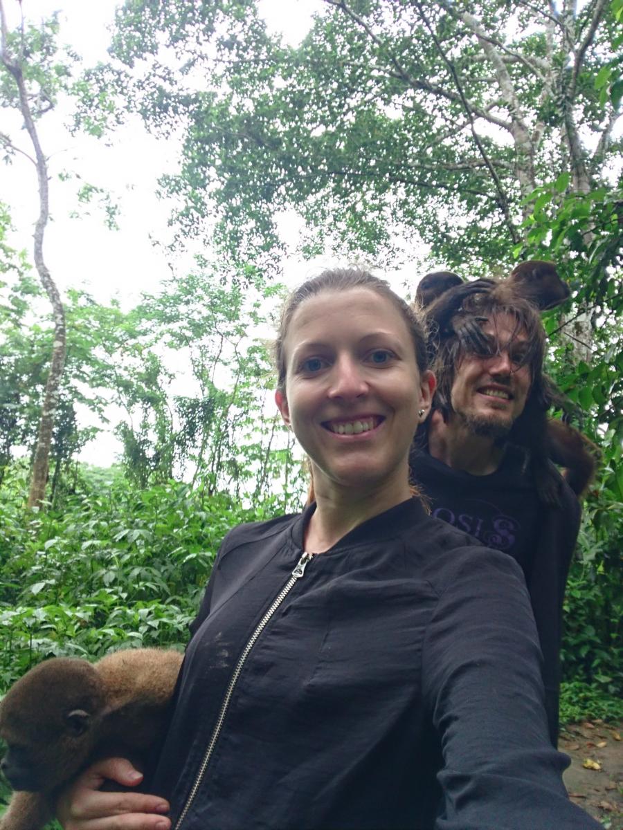 After a short walk alone through the jungle we reached the “office“. Some of the animal inhabitants already welcomed us by climbing quickly onto us! That was a surprising start, as we didn’t think we would even see monkeys that close and cage-free! As they were still pretty small, the people on the island are working to build them up to reintegrate them to their relatives. A guide showed us around while the monkeys kept on climbing around on us! Christian got some of the small monkeys on his head, while Magda got herself a little one who wanted to be carried around. ๐๐๐